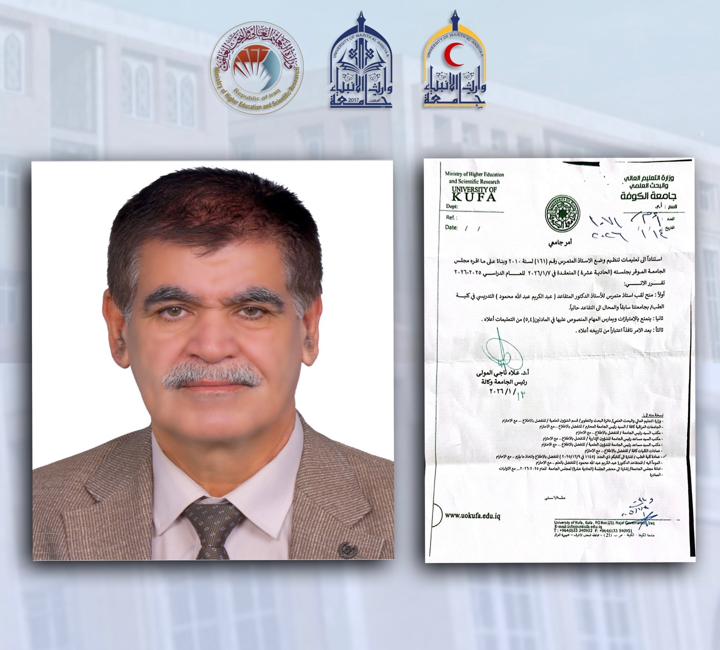 The Dean of the College of Medicine at Warith Al-Anbiya University (peace be upon him) extends his warmest congratulations to Dr. Abdul Karim Abdullah Hamoud, Head of the Community Medicine Branch, on being awarded the title of Professor Emeritus.