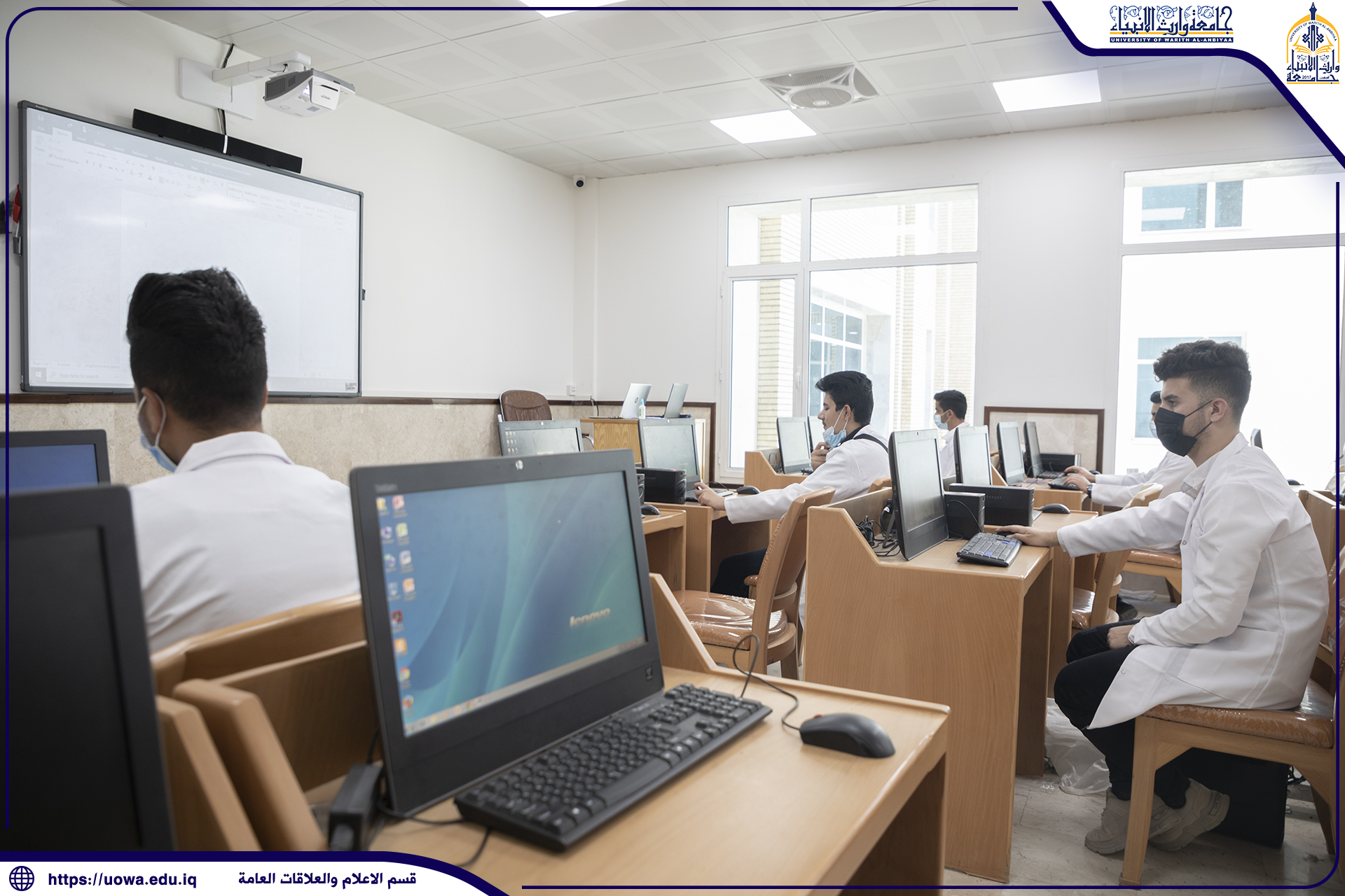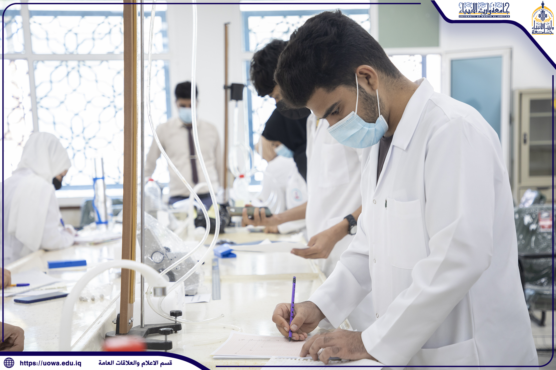طلبة كلية الطب في جامعة وارث الأنبياء(عليه السلام) يتلقون محاضراتهم في المختبرات العلمية ، وأداء بعض التجارب الطبية المختبرية بإشراف مباشر من قبل عميد الكلية الأستاذ الدكتور فالح البياتي والسادة اعضاء هيئة التدريس ، حيث حرصت رئاسة الجامعة على توفير افضل المعدات والاجهزة المختبرية الحديثة للتدريس العملي في الكلية، مع التأكيد على الإلتزام بالاجراءات الوقائية الصحية وارتداء الكمامات للوقاية من عدوى الجائحة.