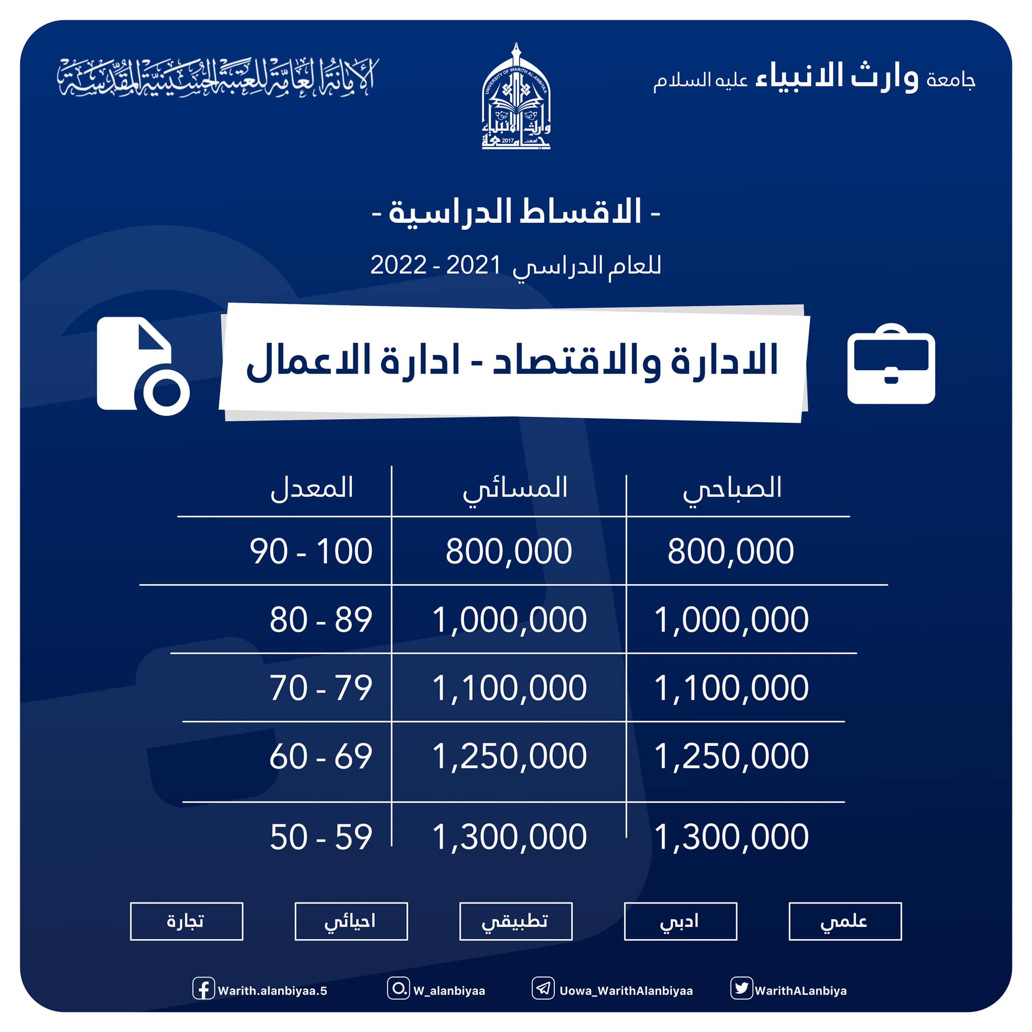 الطلبة الاعزاء الراغبين بالتقديم على كلية الادارة والاقتصاد في جامعة وارث الانبياء(عليه السلام)