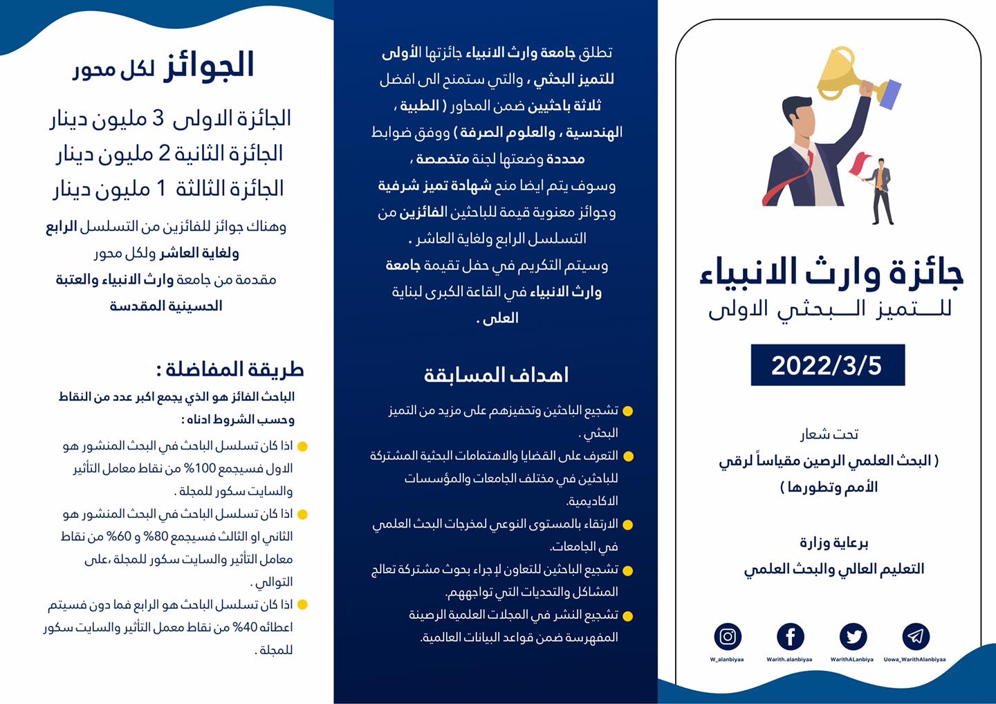تحت شعار ( البحث العلمي الرصين مقياساً لرقي الأمم وتطورها)تقيم جامعة وارث الأنبياء(عليه السلام)مسابقتها الأولى للتميز البحثي،