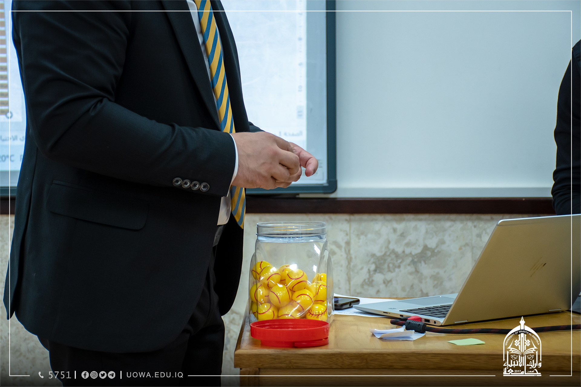 وقال المدرس الدكتور همام الخفاجي رئيس قسم النشاطات الطلابية : برعاية السيد رئيس الجامعة الاستاذ الدكتور ابراهيم الحياوي ستنطلق يوم السبت الموافق 26/11/2022 بطولة وارث الانبياء لخماسي الكره، وستكون منافسات هذه البطولة بين فرق من كليات واقسام الجامعة، وهذا الاجتماع تم لمناقشة نظام البطولة واجراء القرعة، اذ ضمت البطولة 32 فريق من كل أقسام ومراحل الكليات، وبنظام التسقيط الفردي بواقع مبارايتين كل يوم.
