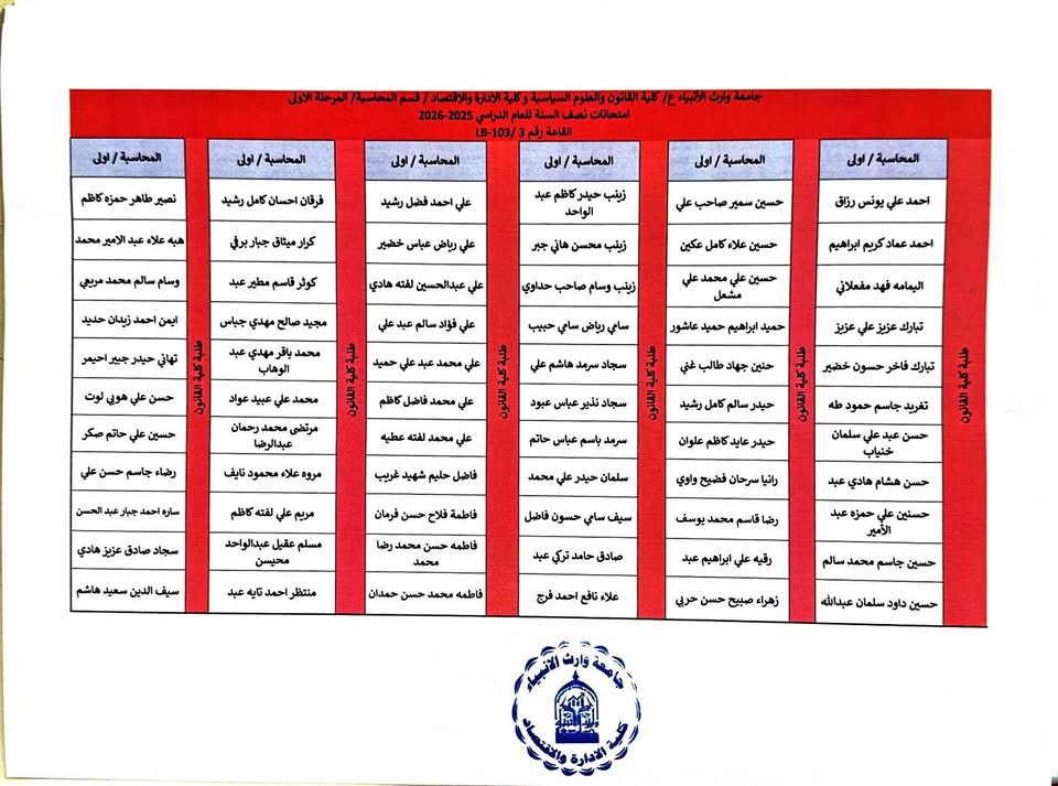 انجاز اكاديمي جديد بتصدر قسم المحاسبة في جامعة وارث الأنبياء(ع)