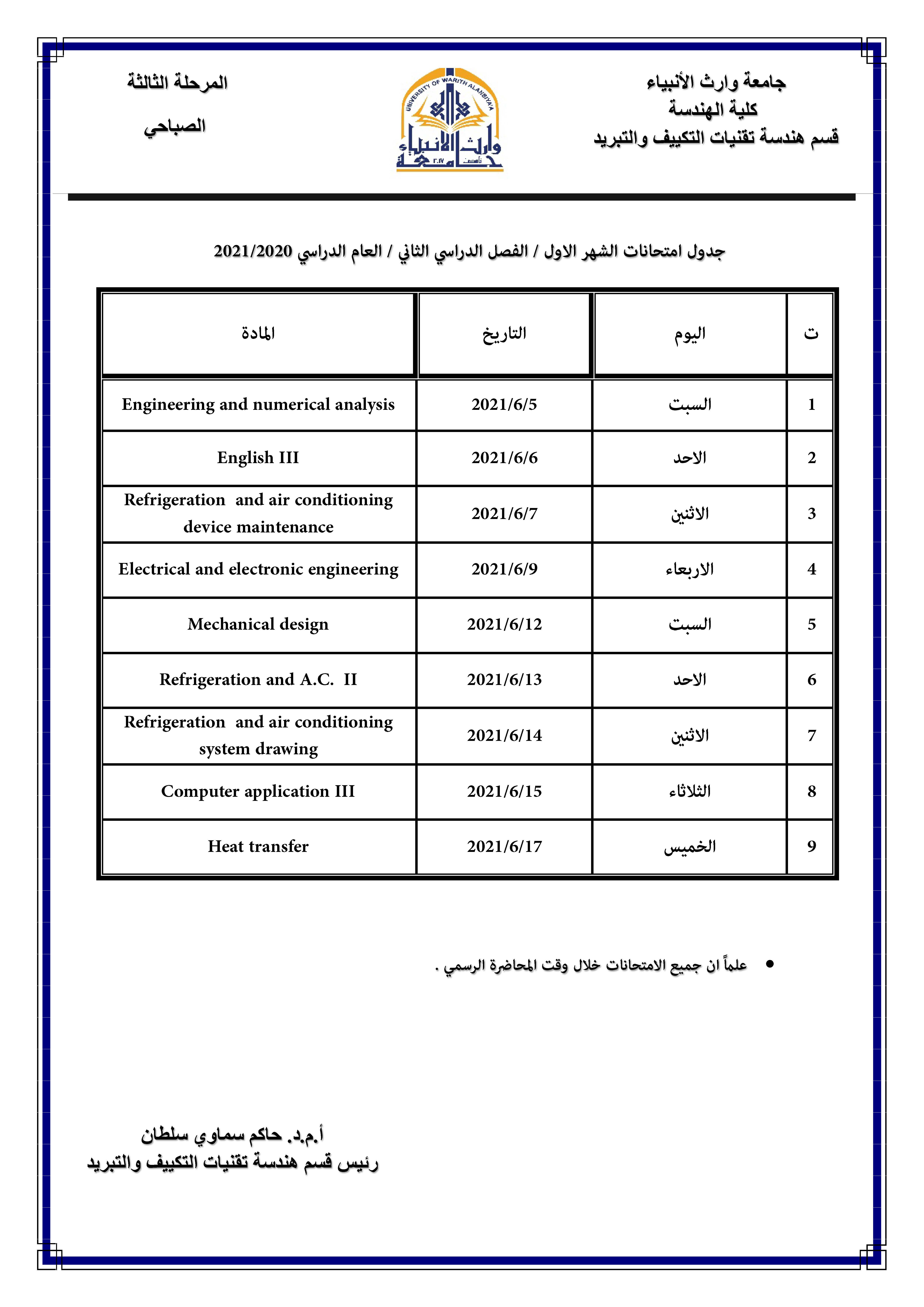 1. يكون امتحان جميع المراحل الساعة الثالثة مساءً وللدراستين الصباحية والمسائية.