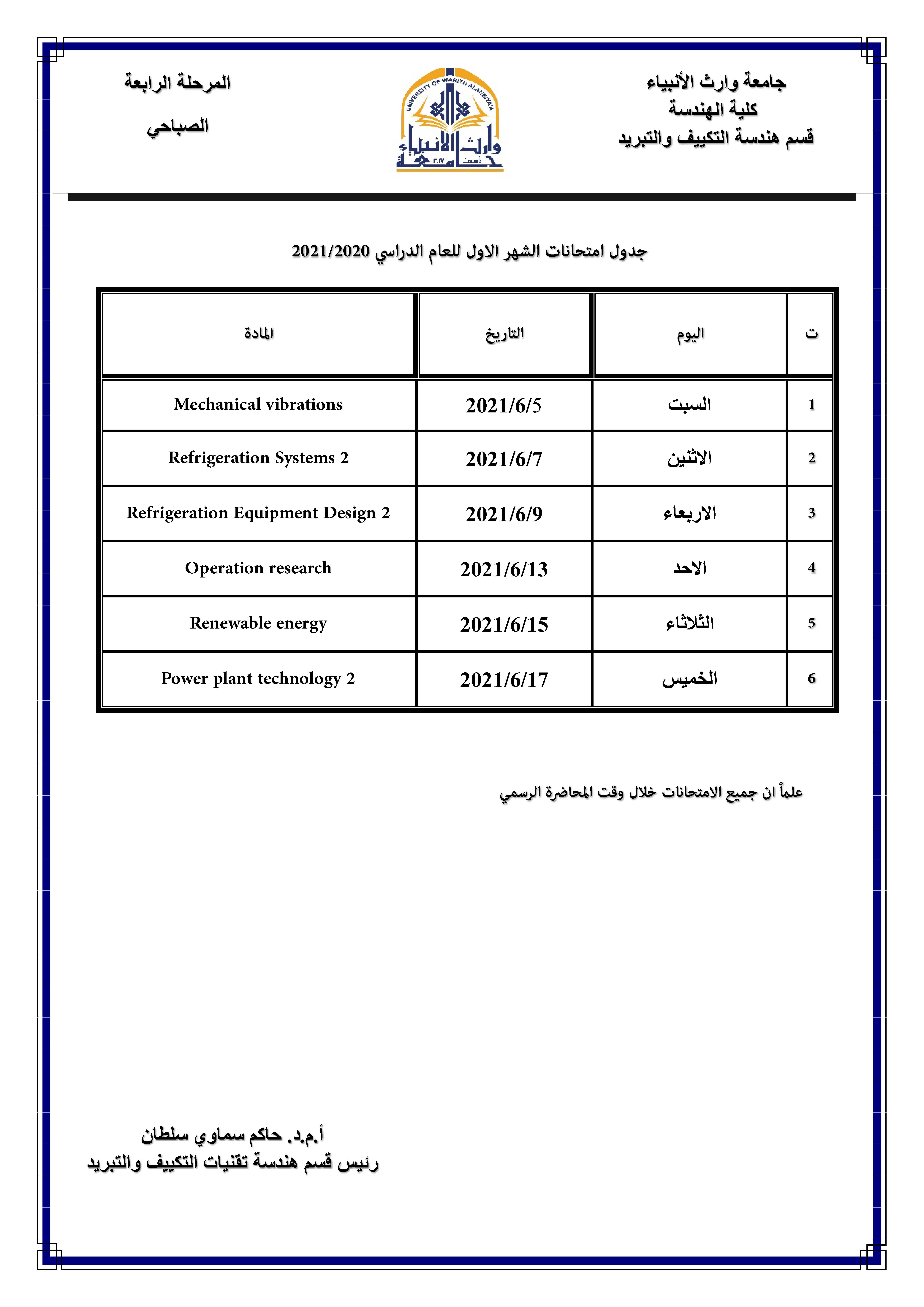 يقيم قسم هندسه الطب الحياتي بالتعاون مع قسم التعليم المستمر في جامعه وارث الأنبياء سلسلة من الحلَقات النقاشية الحضورية ابتداءاً من يوم الأحد المصادف 30/5/2021 و كما في الجدول المرفق.