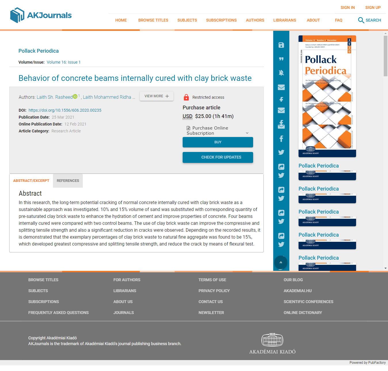 نشر الباحثين والتدريسيين في قسم الهندسة المدنية في جامعة وارث الأنبياء (عليه السلام) م.م. ساره علاء عبدالامير و م.م. عبدالرسول ثامر عبدالرسول بالاشتراك مع فريق بحثي مكون من التدريسيين في كُلْيَة الهندسة في جامعة كربلاء أ.م.د. ليث شاكر رشيد عميد كُلْيَة الهندسة و أ.م.م. ليث محمد رضا بحثاً علمياً باسم جامعة وارث الأنبياء (عليه السلام) بعنوان: