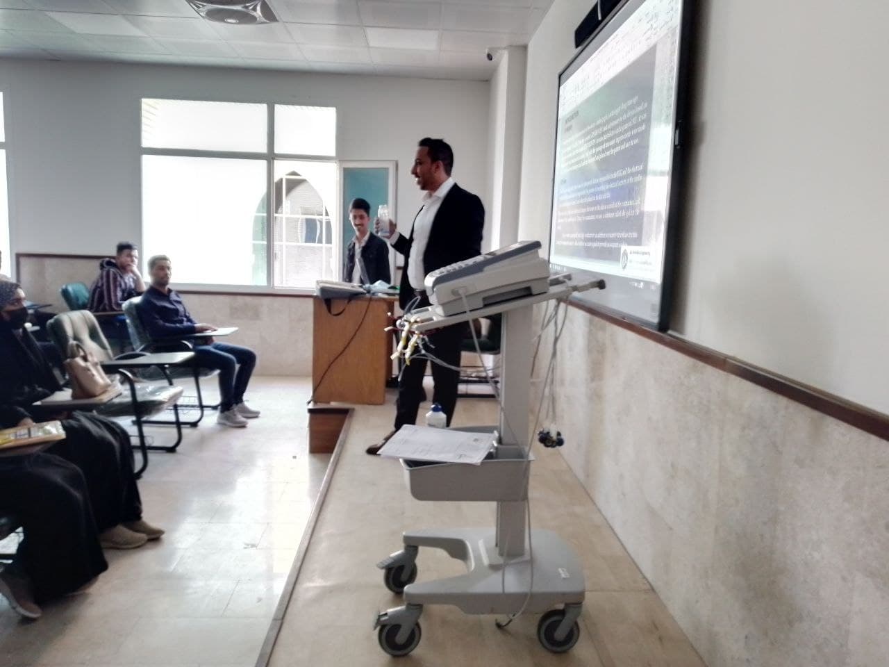 ندوة تفاعليه قدمها طلبة المرحلة الثالثة في قسم هندسة الطب الحياتي وتم احضار جهاز (Electrocardiography) الى القاعه الدراسية حيث وضح الطلبة ان القلب ينتج نشاطا كهربائي صغيرا ينتشر من خلال عضلة القلب ويسبب في حدوث انقباض ويمكن الكشف عن ذلك النشاط الكهربائي من خلال جهاز التخطيط الكهربائي وتحدثوا أيضا عن الأعطال الشائعه التي ممكن ان تحدث بالجهاز وكانت الندوة بحضور رئيس القسم واستاذ المادة و بعض من تدريسيي القسم.
