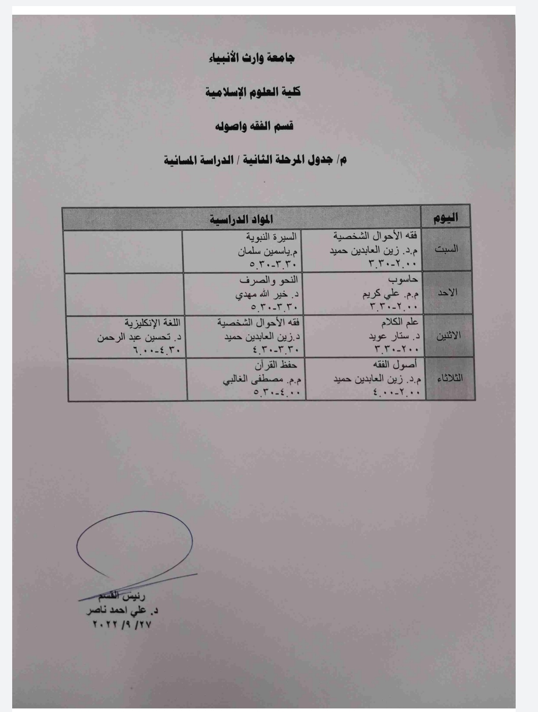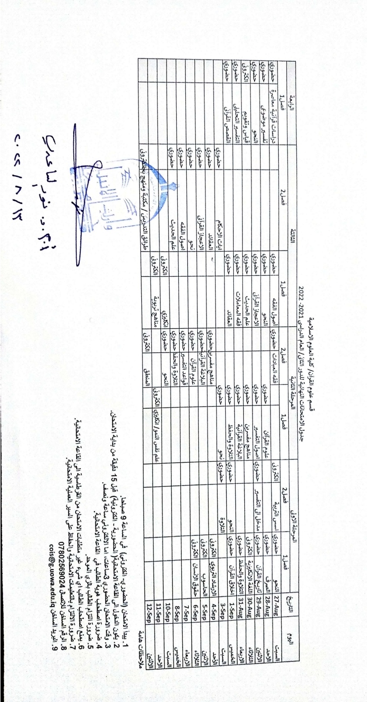 جدول الدروس الاسبوعي لطلبة قسم الفقه واصوله للعام الدراسي 2022-2023...