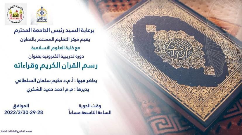 برعاية السيد رئيس الجامعة المحترم تقيم كلية العلوم الإسلامية بالتعاون مع مركز التعليم المستمر دورة علمية تخصصية تحت عنوان (آليات تحقيق وترميم المخطوطات القديمة)يحاضر فيها الدكتور حسين جهاد الحساني. ولمدة ثلاثة أيام، اعتبارا من يوم الثلاثاء، والأربعاء، والخميس الموافق (5، 6، 7/ 4 / 2022) الساعة التاسعة مساءً، وعلى الرابطhttps://meet.google.com/nus-ngfi-vxr ، الفئة المستهدف أعضاء الهيئة التدريسية والباحثون والطلبة.