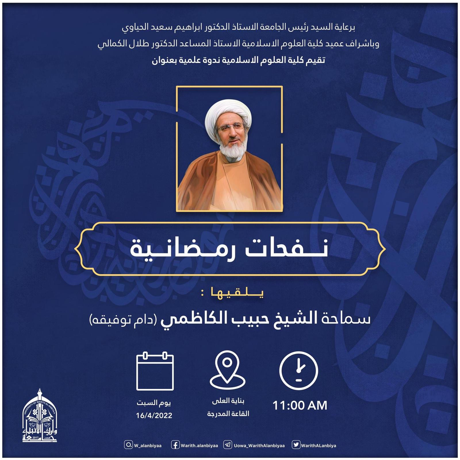 عقدت كلية العلوم الإسلامية في جامعة وارث الانبياء ندوة علمية تحت عنوان نفحات رمضانية قدمها سماحة الشيخ حبيب الكاظمي دامت توفيقاته على القاعة المدرجة في بناية العلى .