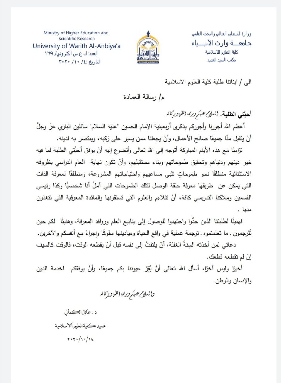 كلمات من الشكر والثناء والدعاء قدمها عميد كلية العلوم الإسلامية المحترم (الدكتور طلال فائق الكمالي) لأبنائنا واعزائنا الطلبة في نهاية العام الدراسي
