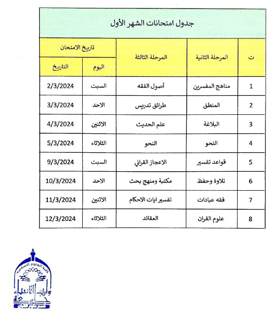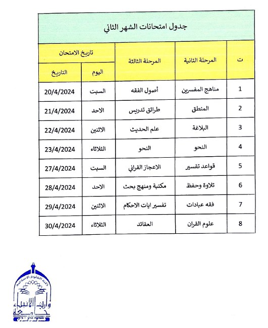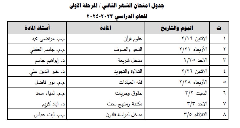 طلبتنا الاعزاء في قسم علوم القرآن .. نرفق لكم جدول الامتحانات النهائية للفصل الاول من العام الدراسي 2023-2024 و للمرحلة الأولى مع التعليمات الامتحانية متمنين لكم دوام التوفيق و النجاح. ملاحظات: 1- يبدأ الإمتحان الساعة 9 صباحا. 2- يكون الدخول إلى القاعة الإمتحانية قبل 15 دقيقة من بداية الإمتحان. 3- وقت الإمتحان 3 ساعات. 4- ضرورة اصطحاب هوية الطالب في القاعة الإمتحانية. 5- يمنع اصطحاب الطالب أي شيء غير متطلبات الإمتحان من قرطاسية الى القاعة الامتحانية. 6- الإجابة بالقلم الجاف الأزرق أو الأسود حصرا. 7- الإلتزام بالزي الموحد المحتشم. 8- الإلتزام بالتعليمات الإمتحانية والحفاظ على سير العملية الإمتحانية.