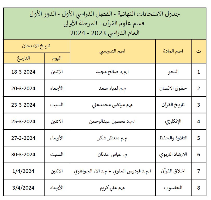 جدول الامتحانات النهائية للفصل الاول من العام الدراسي 2023-2024 قسم علوم القرآن - المرحلة الأولى