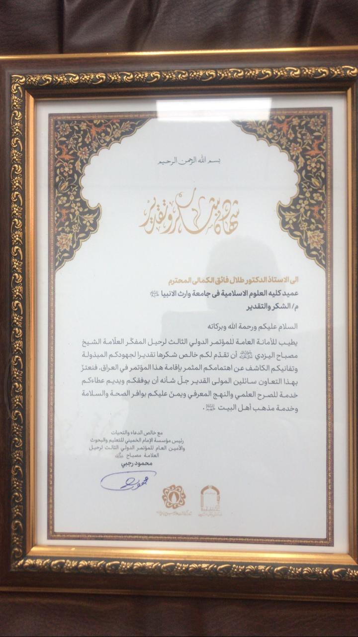 تكريم الدكتور طلال فائق الكمالي عن جهوده في تنظيم مؤتمر العلامة مصباح اليزدي