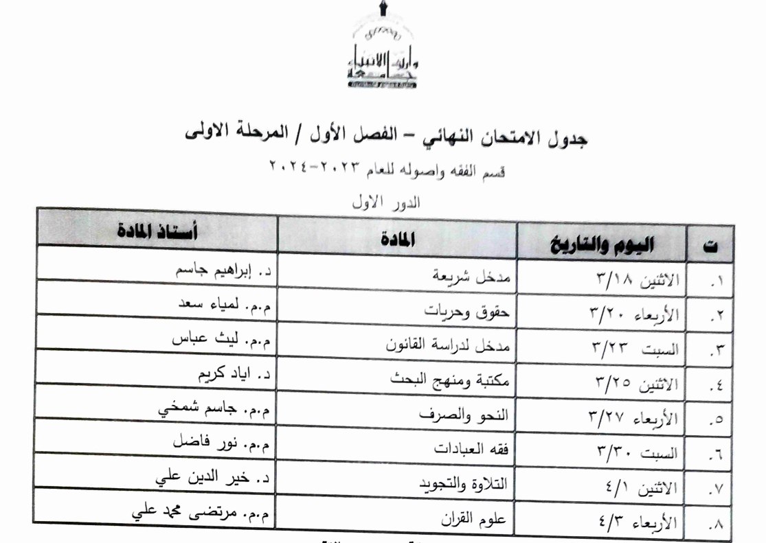 طلبتنا الاعزاء في قسم الفقه وأصوله .. نرفق لكم جدول الامتحانات النهائية للفصل الاول من العام الدراسي 2023-2024 و للمرحلة الأولى مع التعليمات الامتحانية متمنين لكم دوام التوفيق و النجاح.