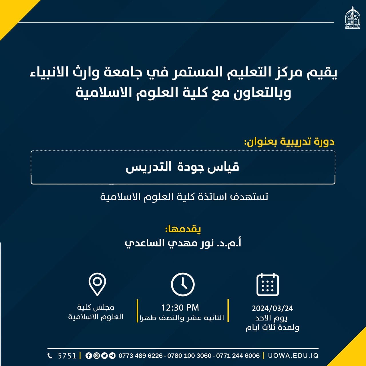 نظّم مركز التعليم المستمر في جامعة وارث الأنبياء بالتعاون مع كلية العلوم الإسلامية دورة تدريبية مهمة بعنوان "قياس جودة التدريس"، حيث استهدفت أساتذة الكلية بهدف تطوير مهاراتهم في مجال التدريس وتقييم جودة أدائهم التعليمي.