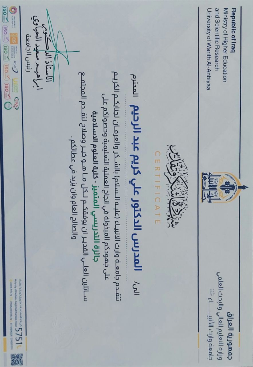 حصل المدرس المساعد علي كريم عبدالرحيم، التدريسي في كلية العلوم الإسلامية بجامعة وارث الأنبياء، على شهادة التدريسي المتميز من رئاسة الجامعة، وذلك خلال حفل تكريم أقامته الجامعة لتكريم التدريسيين المتميزين يوم الثلاثاء 1/10/2024 بحضور السيد رئيس الجامعة الأستاذ الدكتور إبراهيم سعيد الحياوي، والسادة مساعدي رئيس الجامعة، وعمداء الكليات، وعدد من التدريسيين.
