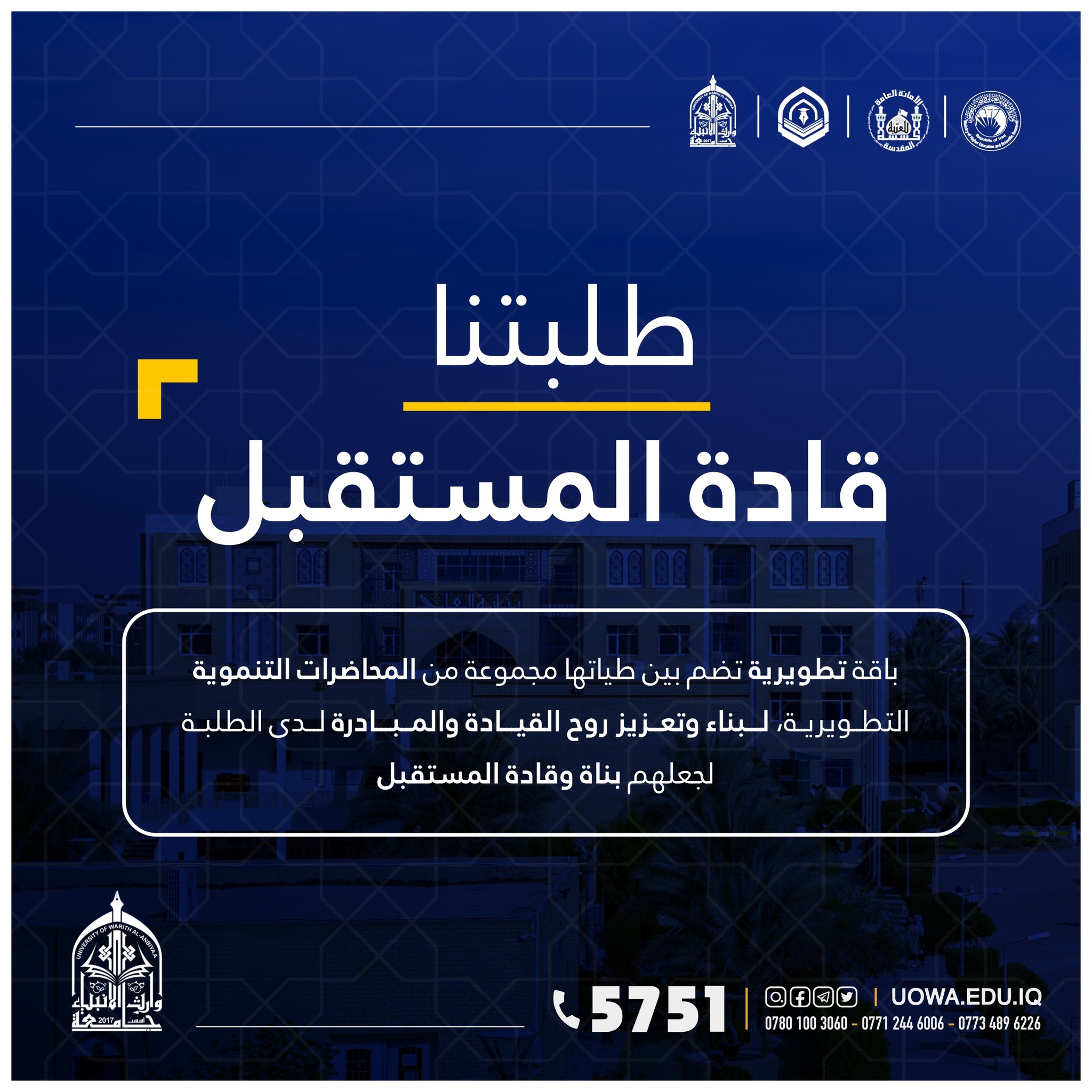 "طلبتنا قادة المستقبل" برنامج تدريبي يطلقه مركز التعليم المستمر في جامعة وارث الانبياء(عليه السلام) لطلبة الجامعة ،ابتداً من يوم الاحد المصادف 9/10/2022 ،ولمدة تسعة ايام.