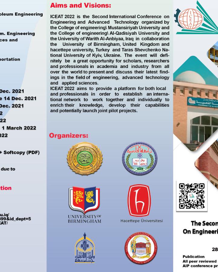حرصاً على ديمومة التعاون العلمي بين مؤسسات التعليم العالي في العراق ولما تمتلكه الجامعة من قامات علمية وأكاديمية،انضمت جامعة وارث الانبياء(عليه السلام) الى الهيئة التنظيمية للمؤتمر الدولي الثاني للهندسة والتقنيات المتقدمة(ICEAT-2022) ،الذي ستقيمه كلية الهندسة بجامعة القادسية ،وبمشاركة كلية الهندسة بالجامعة المسنتصرية ،إضافة الى جامعات دولية اخرى (جامعة حجة تبه التركية و جامعة برمنكهام البريطانية وجامعة كييف الوطنية) ،حيث سيعقد المؤتمر افتراضياً بسبب ضروف الجائحة في العاصمة التركية إسطنبول بتاريخ ٢٨ -٢٩ / ٣/ ٢٠٢٢وسيتم نشر كافة البحوث في مجلة AIP المفهرسة ضمن مستوعبات سكوبس.بإمكان السادة الباحثين المشاركة بالمؤتمر ببحوثهم العلمية القيمة عبر الروابط الآتية:رابط المؤتمرhttps://uomustansiriyah.edu.iq/web_page.php?page_id=2899...رابط قناة التلكرام للاجابة على استفسارات الباحثين الاعزاءhttps://t.me/+aEWuEsX8uk8zZjAyرابط المشاركة كمقيم في المؤتمرhttps://surveyheart.com/for
