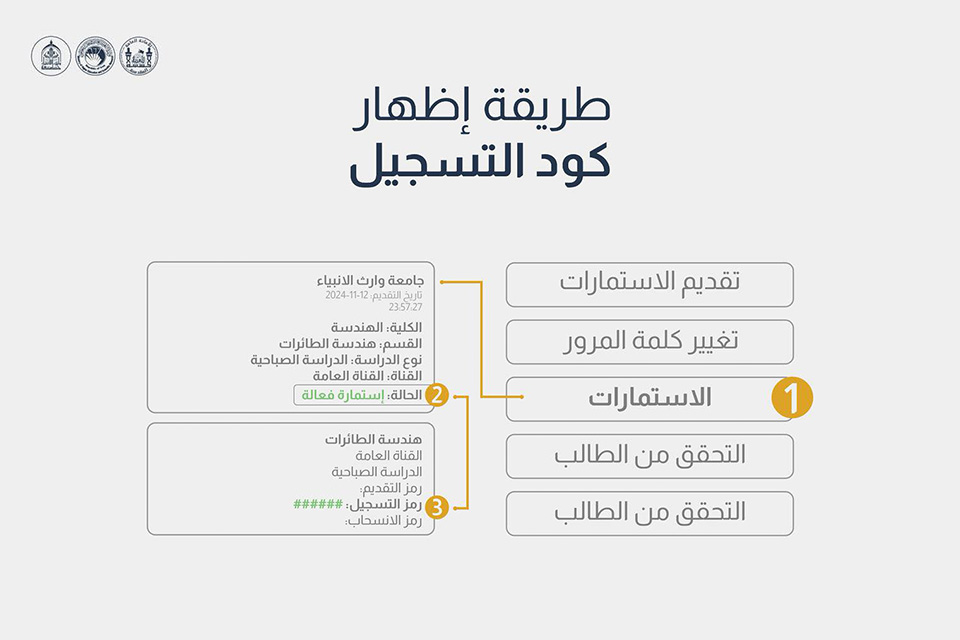 - يقوم الطالب بأخذ كود التسجيل الإلكتروني للكلية والقسم الذي ظهر قبوله فيه، ويذهب إلى الجامعة ويبدأ عملية التسجيل فيها.