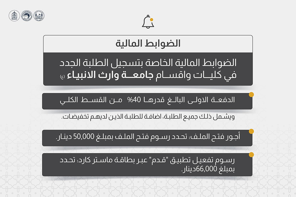 الدفعة الاولى البالغ قدرها 40% من القسط الكليويشمل ذلك جميع الطلبة، اضافة للطلبة الذين لديهم تخفيضات.أجور فتح الملف: تحدد رسوم فتح الملف بمبلغ 50000دينار.رسوم تفعيل تطبيق "قدم" عبر بطاقة ماستر كارد: تحدد بمبلغ 66,000دينار.يظهر للطالب عبارة "متاح للتسجيل " عندها يمكنه جلب كود التسجيل الى الجامعة.المستمسكات المطلوبة لعملية التسجيل:- كود التسجيل (ويتم الحصول عليه من خلال التطبيق).- الوثيقة الدراسية المصدقة اوتأييد بالدرجات- شهادة الجنسية وهوية الأحوال المدنية أو البطاقة الوطنية الموحدة (للطالب والاب والام).- صور حديثة عدد ٦- استمارة الفحص الطبي #ان_وجد-حضور الكفيل مع تأييد استمراية الخدمة وهوية الدائرة( يمكن جلب الكفيل خلال شهر من تاريخ التسجيل)-جلب الدفعة الاولى من القسط السنوي والبالغ ٤٠%-بطاقة #دفع_إلكتروني لدفع مبلغ 66 الف دينار إلكترونياً لتفعيل البرنامج الطالب الوزاري.نود اعلام الطلبة الاعزاء ان فريق التسجيل متواجد طيلة ايام الاسبوع من الساعة 8صباحا الى 5 مساءللاستفسار يرجى الاتصال على الأرقام التالية:الرقم المختصر :575107734896226