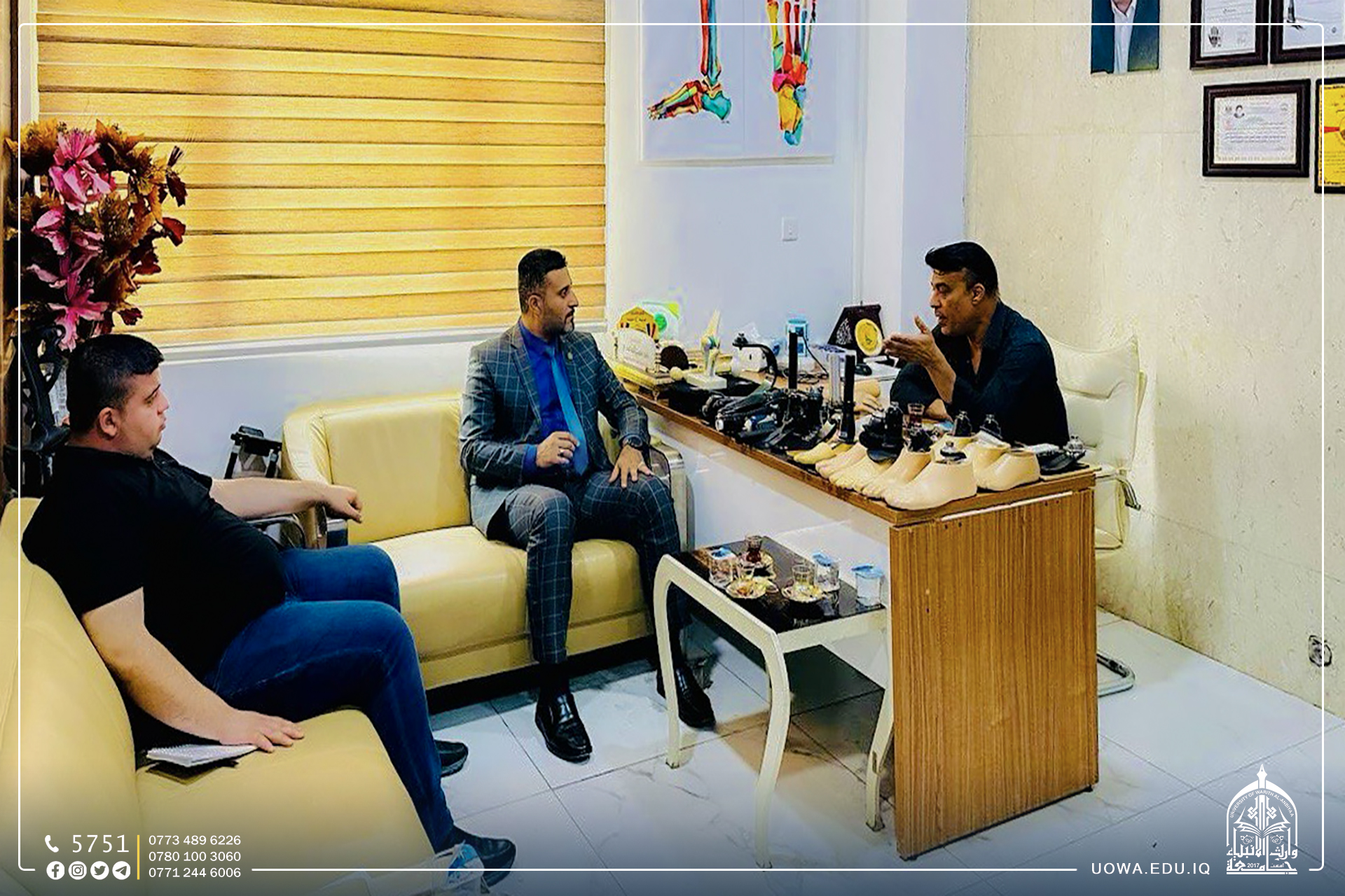 استقبل رئيس الجامعة الاستاذ الدكتور ابراهيم الحياوي، رئيس جامعة كربلاء الاستاذ الدكتور باسم خليل السعيدي، يرافقه المساعد الإداري الاستاذ الدكتور اكرم الياسري الذين زار الجامعة لتقديم التهاني للاستاذ الدكتور واقد الموسوي بمناسبة تسنمه مهام مساعد رئيس الجامعة للشؤون العلمية سائلًا الله عزوجل له الاستمرار في طريق العلم وخدمته لسالكيه وقاصديه وفاء لعراقنا الحبيب.