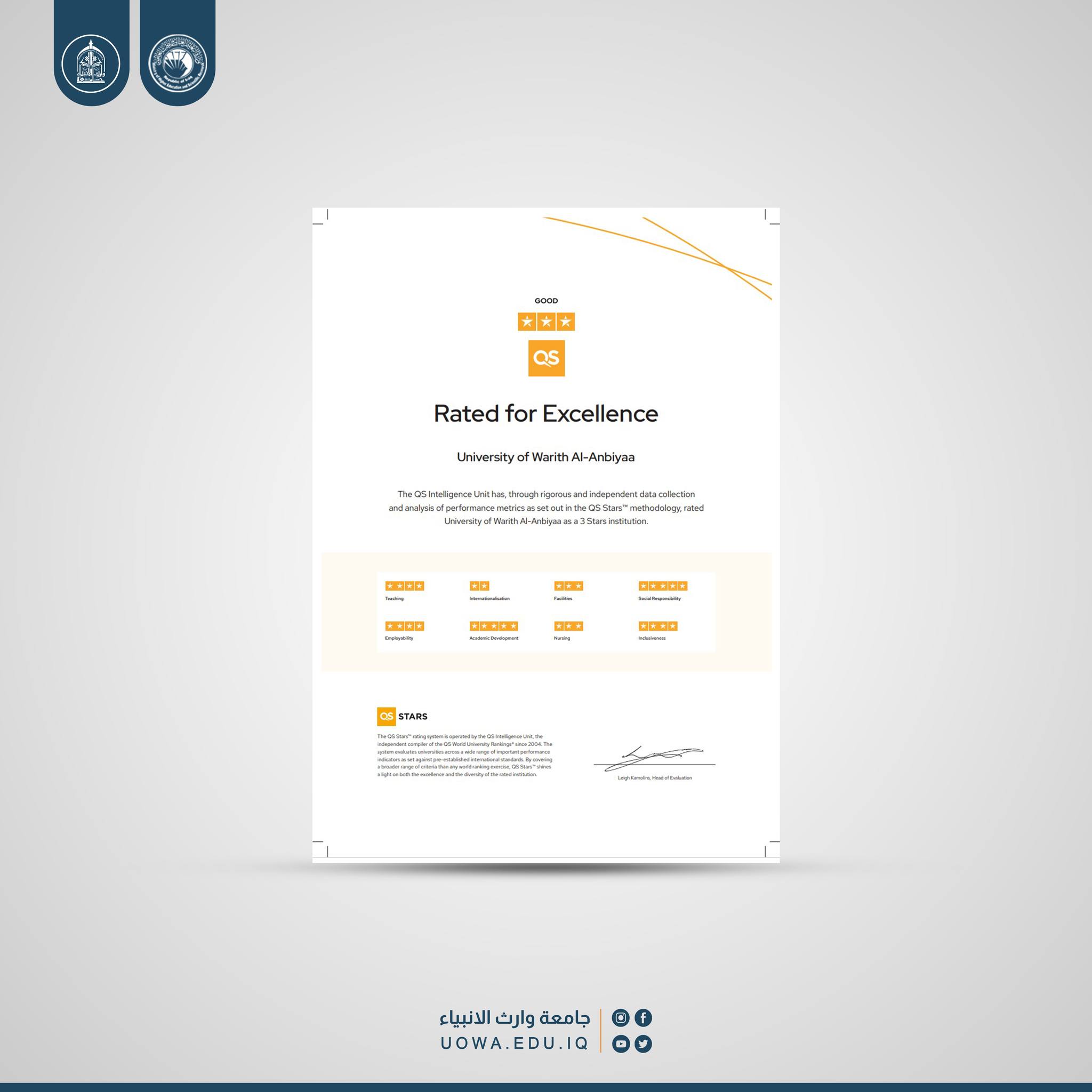 حصلت جامعة وارث الأنبياء (عليه السلام) على تقييم ثلاث نجوم من نظام تقييمQS Stars البريطاني بعد فترة تقييم امتدت لاكثر من ثمانية اشهر، حيث حققت الجامعة نتائج استثنائية في العديد من الجوانب اهمها: