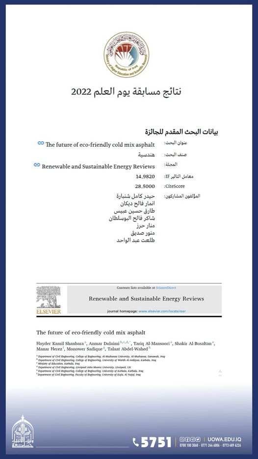 وجاء البحث الفائز بالتعاون مع باحثين من جامعات (المثنى وكربلاء والكوفة وجامعة سوهاج/ مصر)، إضافة الى باحث من جامعة ليفربول جون مورس / بريطانيا.