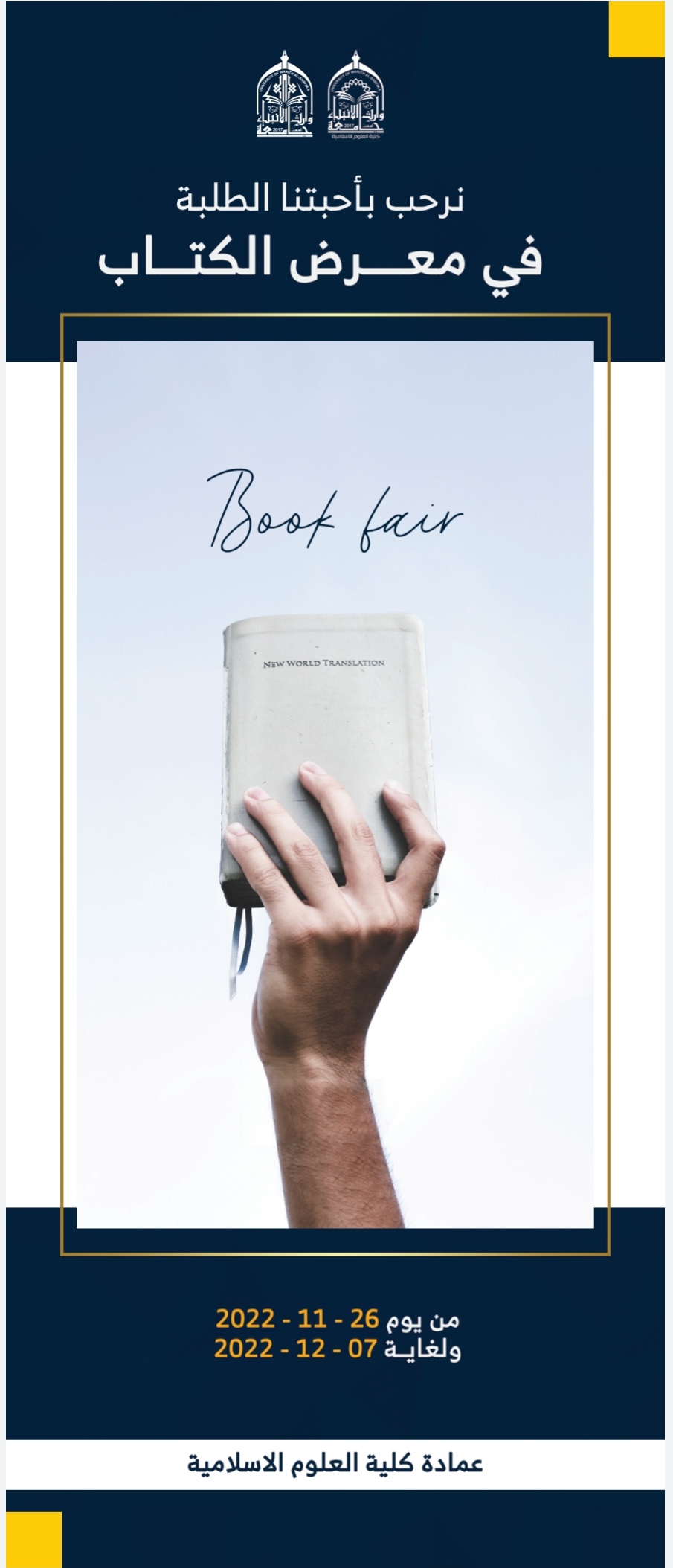 ترحب بكم كلية العلوم الاسلامية في معرض الكتاب والذي يقام على ساحة الكلية في جامعة وارث الانبياء.. وحسب التوقيتات المبينة في الصورة المرفقة.