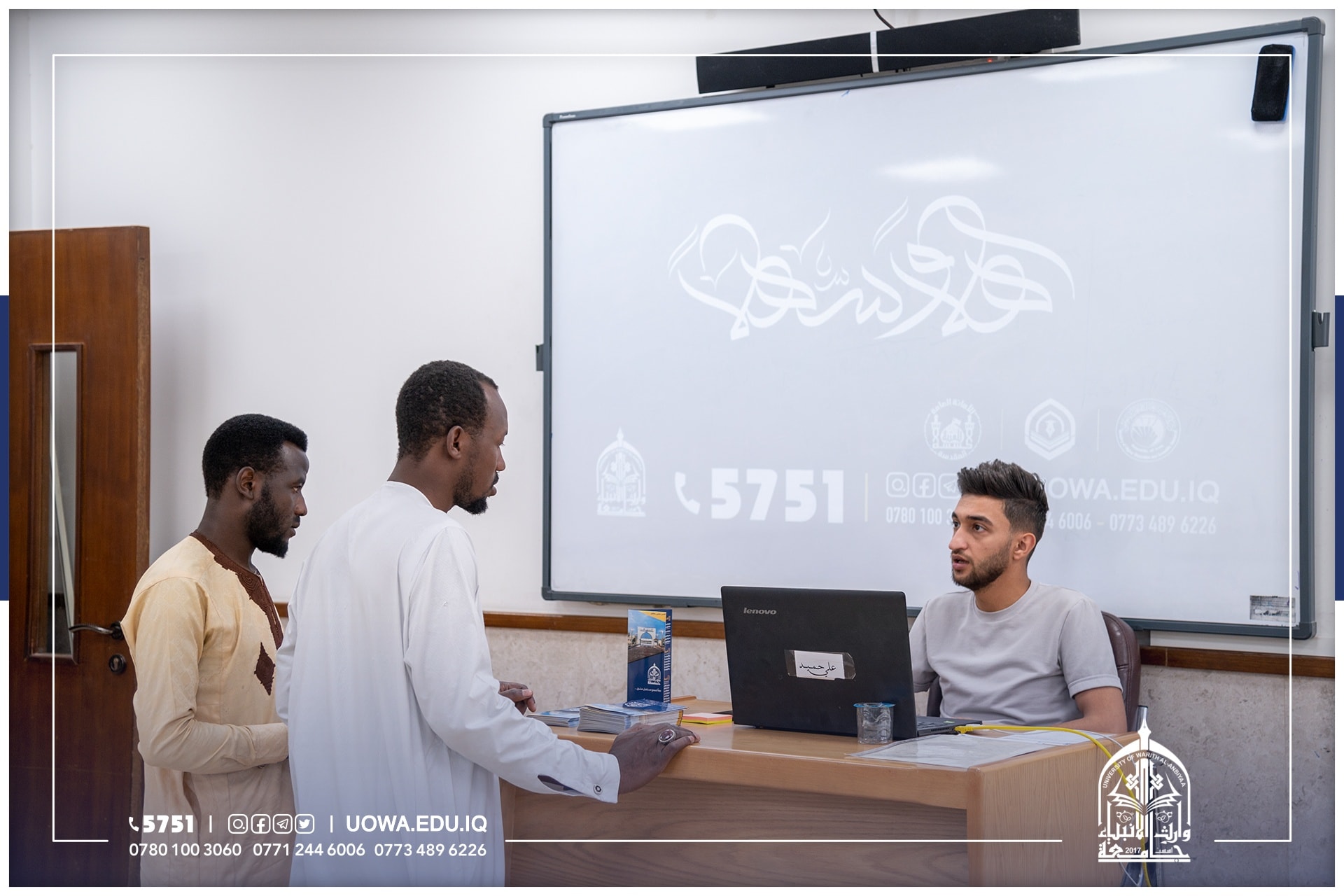 جانب من استقبال فريق التسجيل في جامعة وارث الانبياء (عليه السلام) للطلبة الاعزاء واولياء امورهم الكرام للإجابة عن استفساراتهم ومساعدتهم في انجاز اولى خطوات التقديم، وهي انشاء حساب الطالب وملء البيانات وتفعيل القنوات الخاصة.