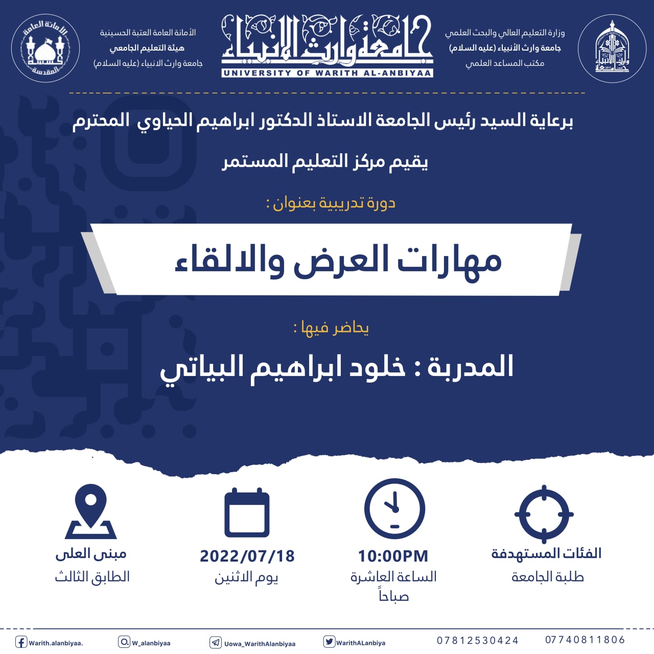 برعاية رئيس جامعة وارث الأنبياء (عليه السلام) الأستاذ الدكتور إبراهيم الحياوي يقيم مركز التعليم المستمر وبالتعاون مع العتبتين المقدستين ومؤسسة الشهداء/ كربلاء دورة تدريبية بعنوان "مهارات العرض والالقاء"