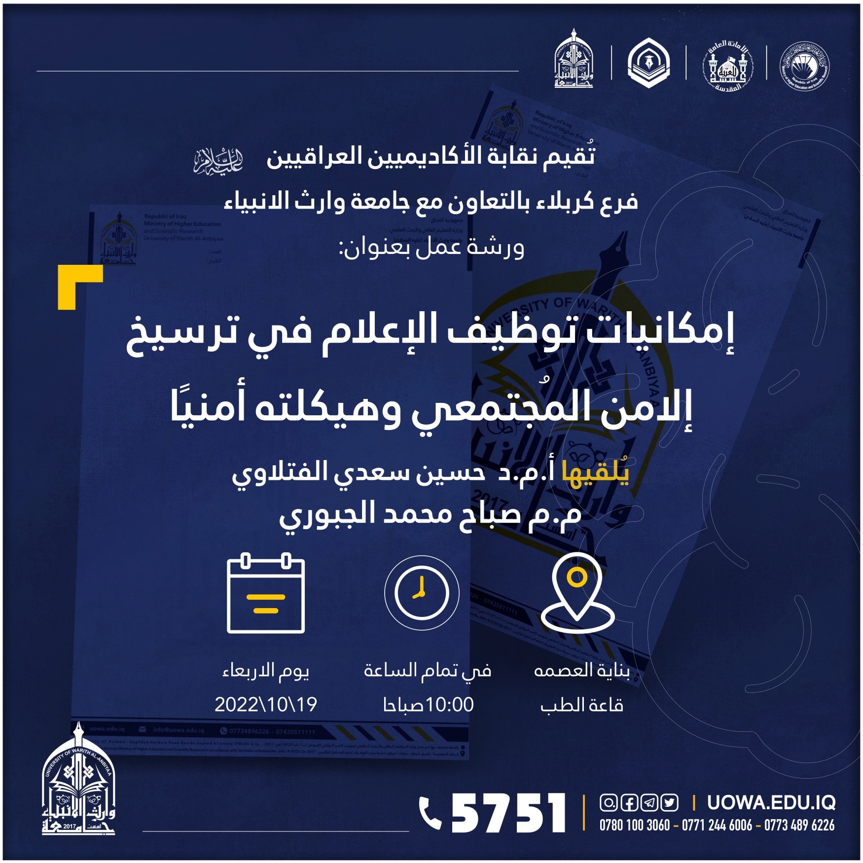 اقامت نقابة الاكاديميين العراقيين فرع كربلاء المقدسة وبالتعاون مع جامعة وارث الانبياء(عليه السلام) ورشة عمل لقيادة شرطة محافظة كربلاء المقدسة بعنوان: امكانيات توظيف الاعلام في ترسيخ الامن المجتمعي وهيكلته امنيا"